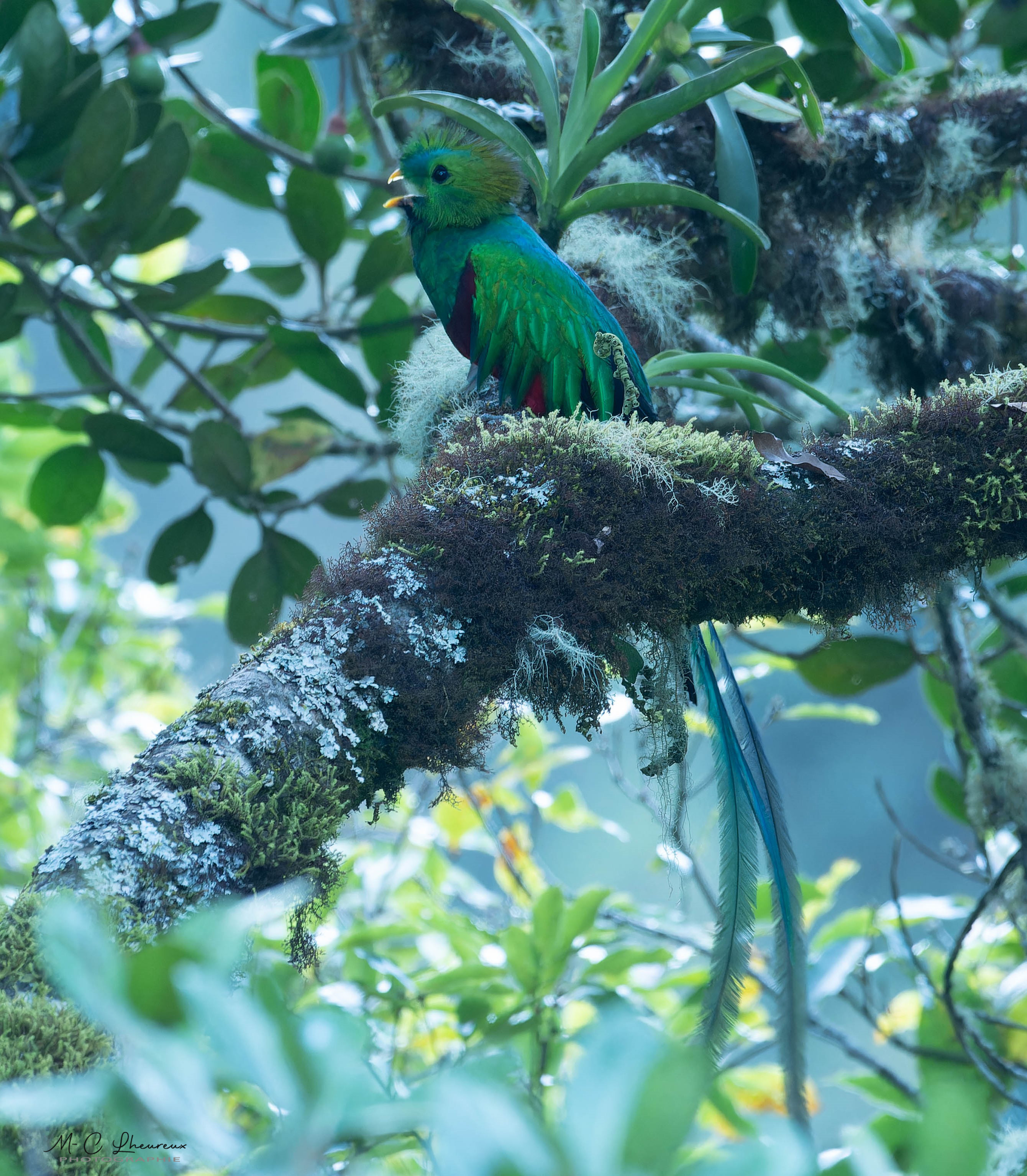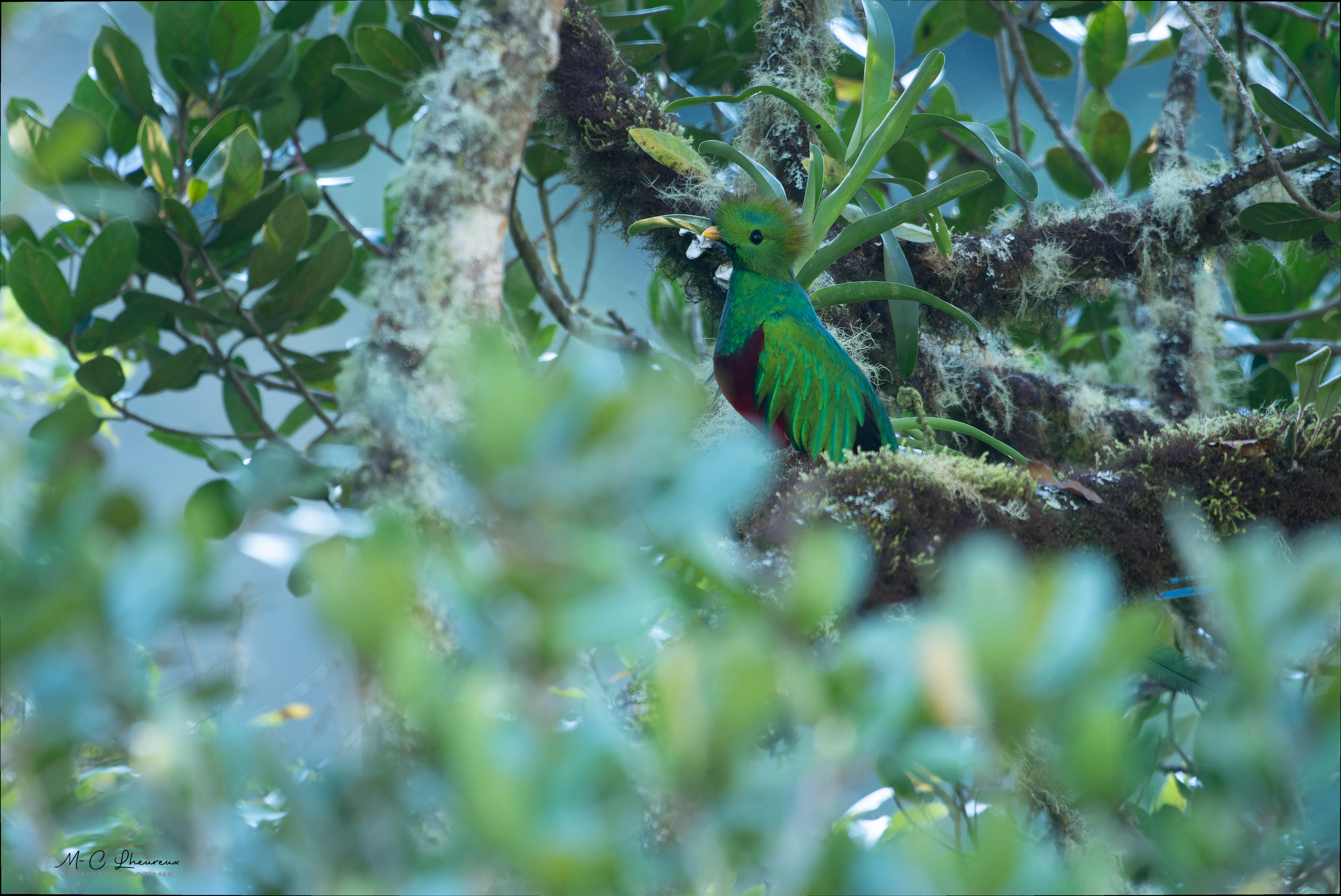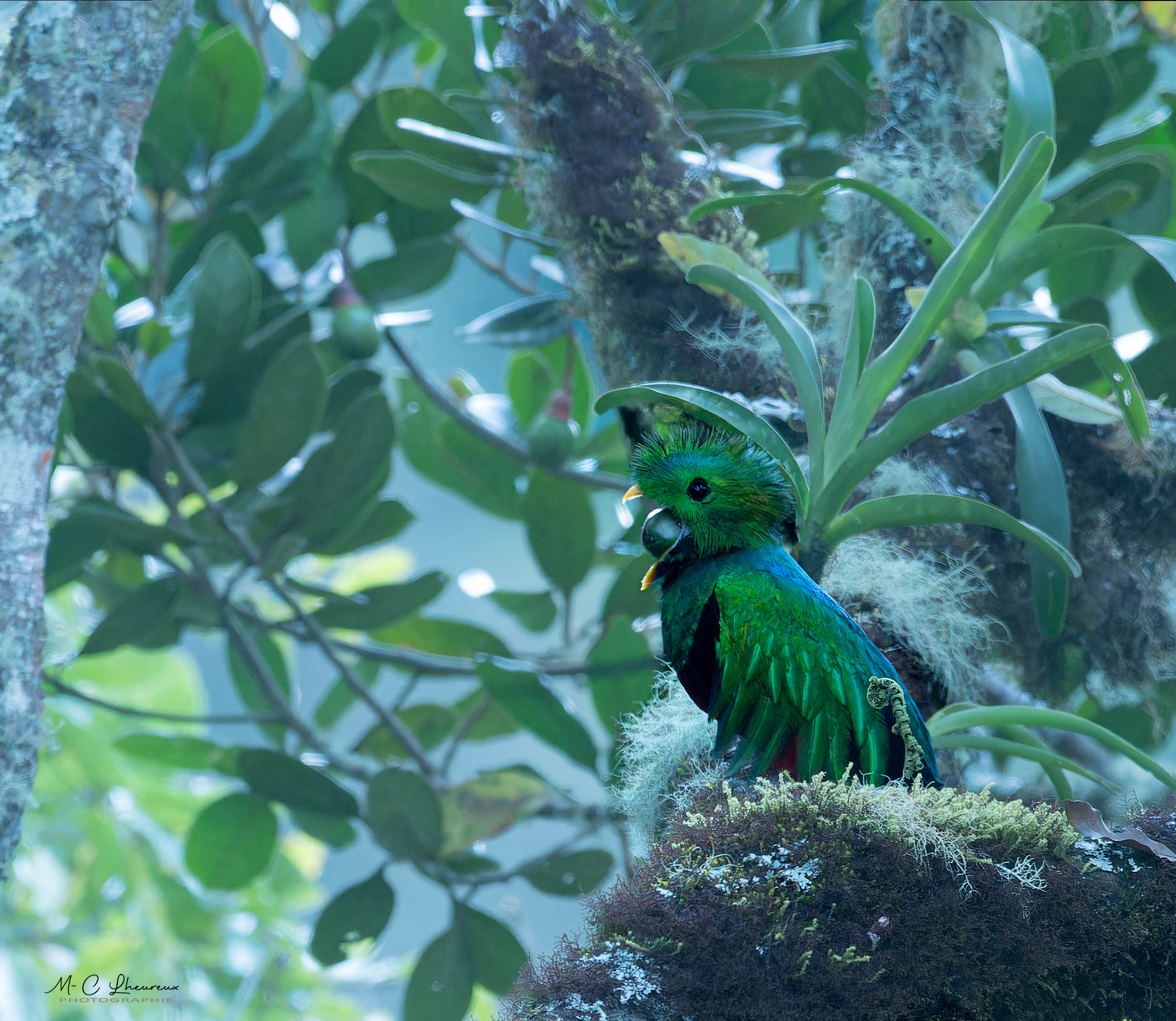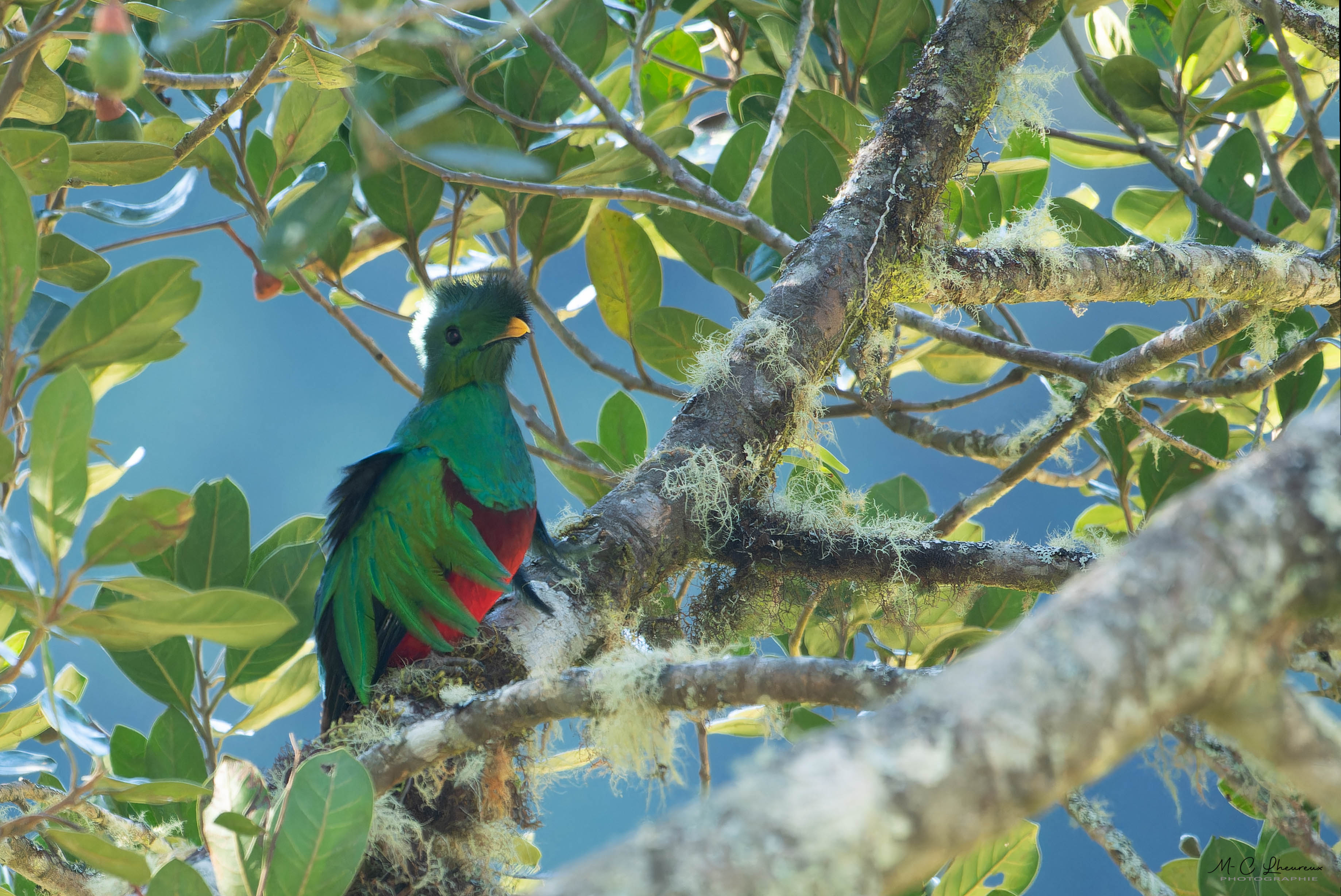 Le guide nous propose de reprendre les véhicules afin de nous rendre sur la propriété d’un habitant du coin. Un quetzal, c’est posé dans un arbre. Il est entrain de s’alimenter et va rester un long moment perché dans ce dernier, ce qui nous permet de réaliser un grand nombre de photos.